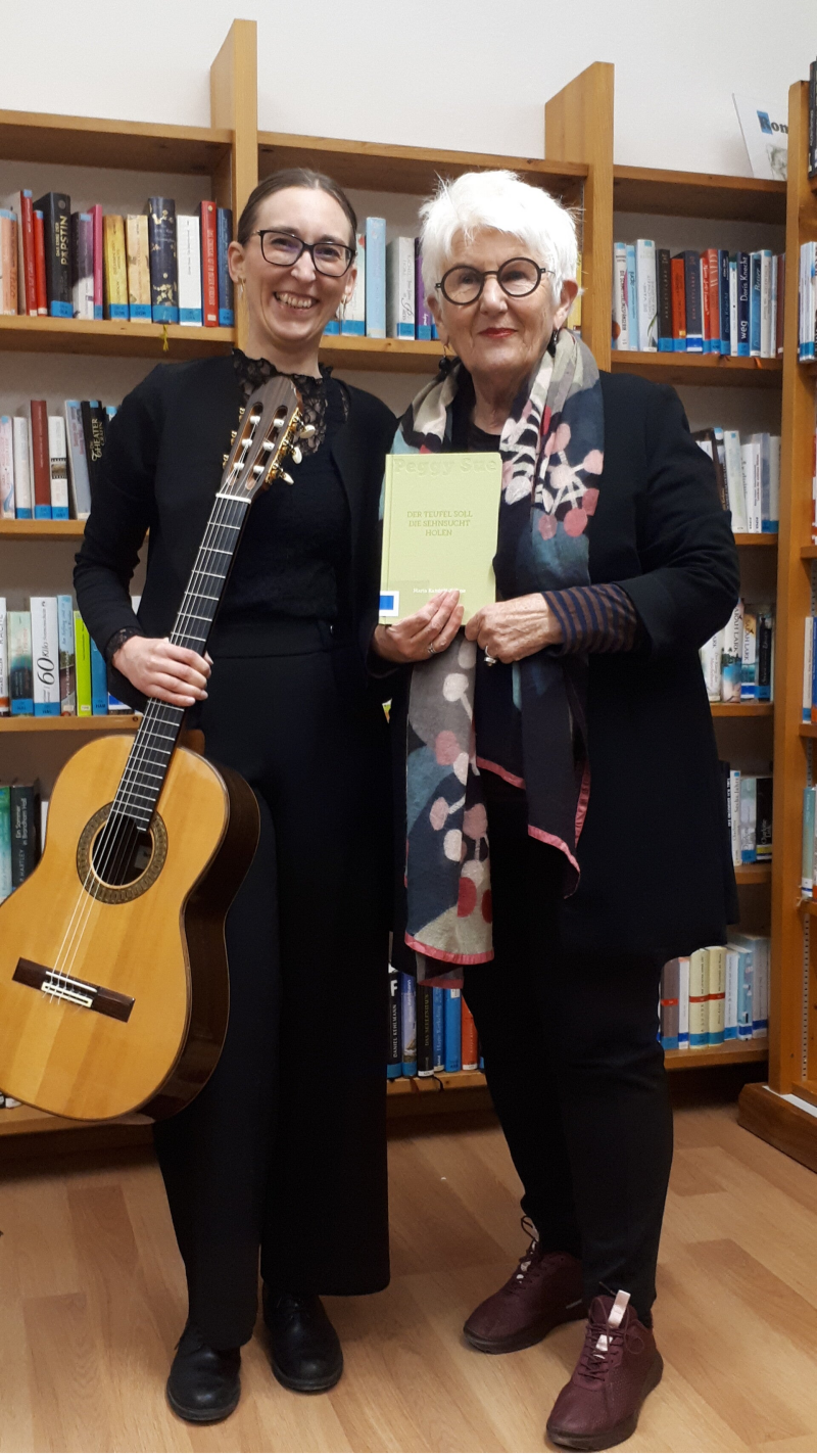 Maria Kandolf-Kühne ist studierte Historikerin und Anglistin. Als gebürtige Vorarlbergerin lebt sie seit 45 Jahren in Tirol im Raum Innsbruck. Romana Hauser wuchs in Kössen im Tiroler Unterland auf. Sie studierte am Tiroler Landeskonservatorium und an der Universität Mozarteum. Sie begleitete die Lesung mit Gitarre und Gesang. Die Textauswahl und die speziell ausgewählten Musikstücke machten den Abend zu einem literarisch-musikalischen Feinschmecker-Abend! Das Publikum war begeistert!