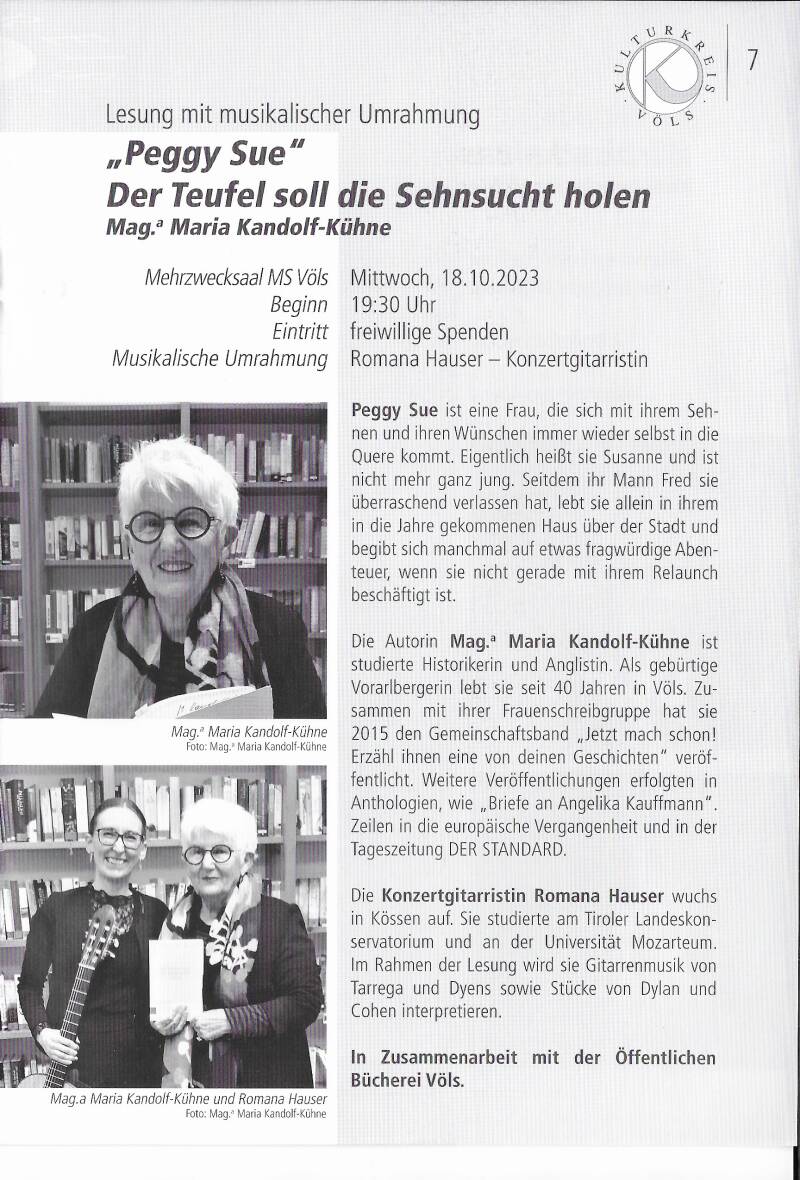 Geschichten über Peggy Sue, deren Wurzeln nach Vorarlberg zurück reichen und die sich nach ihrer Trennung an einer Neuerfindung, ihrem Relaunch versucht. Ein musikalisch-literarisch-humorvoller Abend mit der gebürtigen Vorarlberger Autorin Maria Kandolf-Kühne und der Musikerin Romana Hauser, die Peggy Sue bei ihrem Aufbruch begleiten